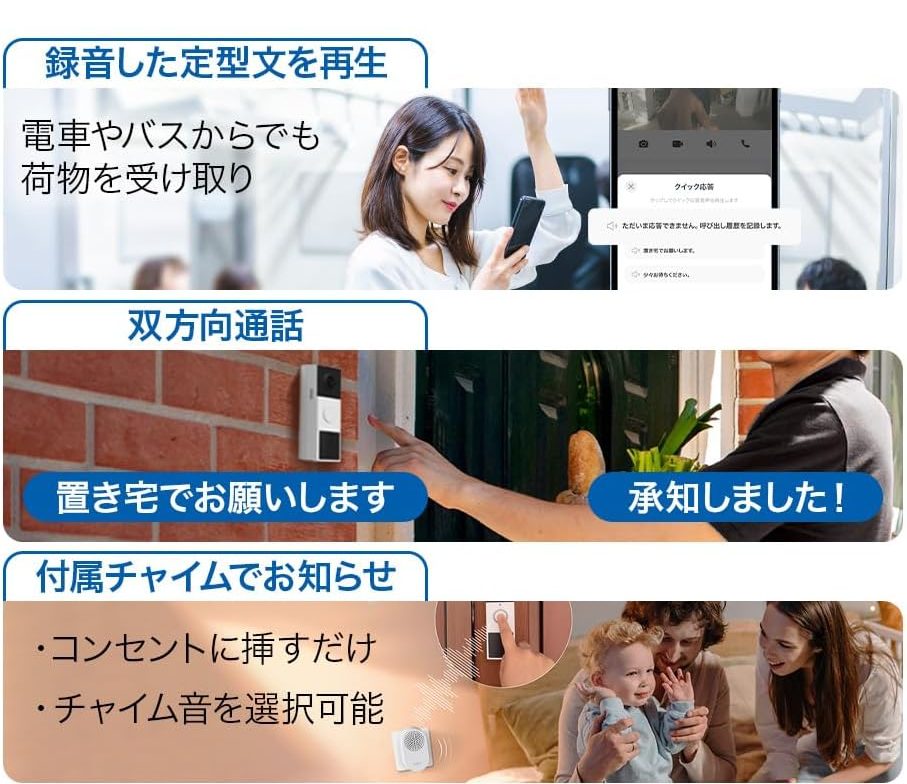 Wi-Fiを介してアプリで操作できるため、配線不要でスマホ対応のドアホンとして使えます。在宅時に訪問者をチェックできるうえ、外出先から訪問者を確認でき、訪問者とコミュニケーションを取ることもできるので安心。戸建て・マンションを問わず、ドアホンの機能に不安を抱えている方は、こちらをメインとして切り替えてみてはいかがでしょうか。