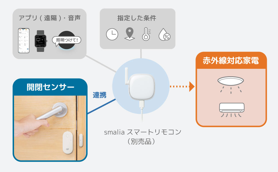 「smalia スマートリモコン RS-WBRCH1」(税込7980円)と組み合わせて使うことで、ドアや窓の開閉状態をスマホに通知。「防犯対策として9時~17時の間に窓が開くとスマホに通知」「18時~21時の間にドアを開けると照明をON」など、時間帯で個別に設定することも可能です。また、「クローゼットのドアを開けると自動で照明をON」など、ドアの開閉をトリガーとした操作もできます。