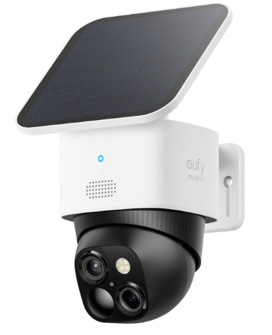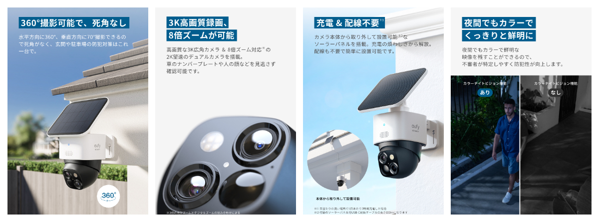 屋外用ソーラーパネル付きセキュリティカメラ。AIによるモーショントラッキング機能を搭載しており、人やペットの動きを検知すると水平方向に360°、垂直方向に70°回転し、対象に追従して広範囲を撮影できます。高画質な3Kかつ135°の広角カメラと、8倍ズームに対応した2K望遠カメラのデュアルカメラを搭載し、車のナンバープレートや人の顔などを見逃すことなく確認できます。