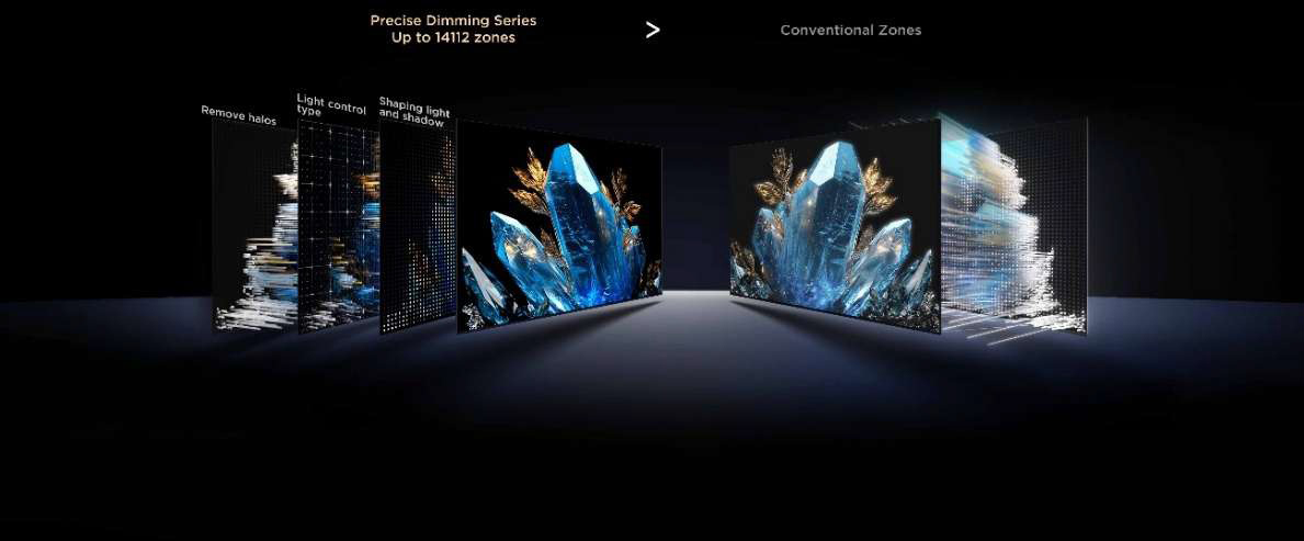 この全領域ハロー制御テクノロジーを実現するために、2024年モデルに比べて53.8%明るくなった発光チップや、チップが発光する光を均一に調光してパネルに送るマイクロレンズ、明暗のディテールを強化するアルゴリズムなど、7つの技術を採用しています。