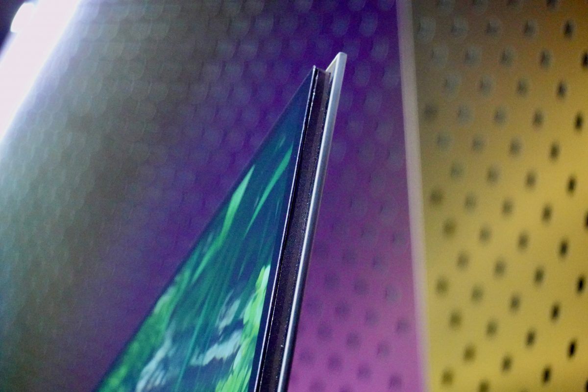 テレビは“空間を演出する道具” ──それを体現するもうひとつの特長に“黒縁”の処理がある。「ベゼルレスデザイン」を徹底的に追求しており、液晶パネルの表示エリアと物理枠の間に残されていた“表示されない黒”の領域──黒縁部分すらも排除した設計となっているのだ。