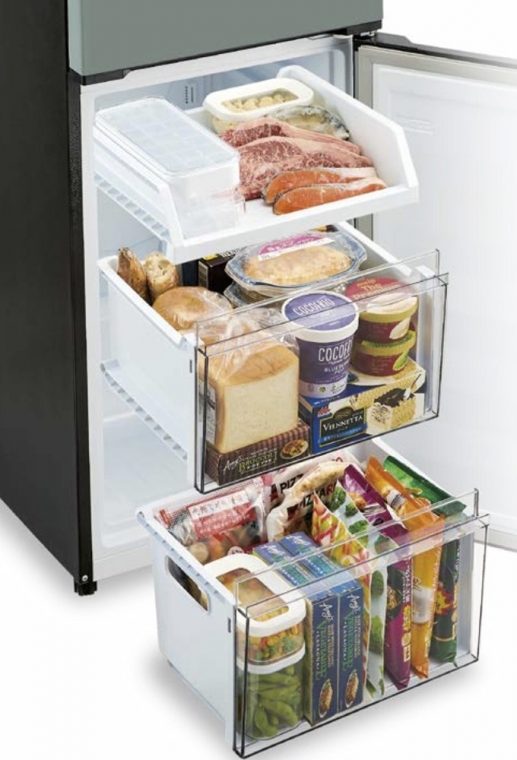 忙しい日々をしっかり支えるクラスNo.1サイズの大容量冷凍室は、同社の冷蔵庫「TZシリーズ」と同タイプの3段引き出し形状を採用。見やすく整理がしやすいので、まとめ買いした冷凍食品や作り置き料理の整理も簡単。冷蔵室や冷凍室で重ねて使えるフタ付き小物ボックスと製氷皿付きです。