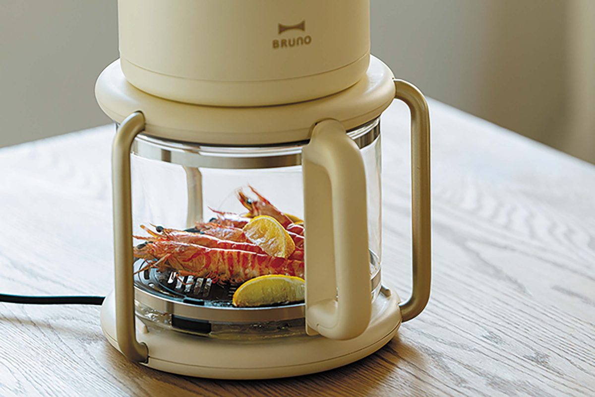 調理中の様子を見ることができるガラス製バスケットを採用し、“美味しい瞬間”を視覚的に楽しめる。最高200℃の熱風による高温調理がシンプル操作で行え、機能性も秀逸。ガラスなので油汚れをサッと落とせて、ニオイも移りにくい。