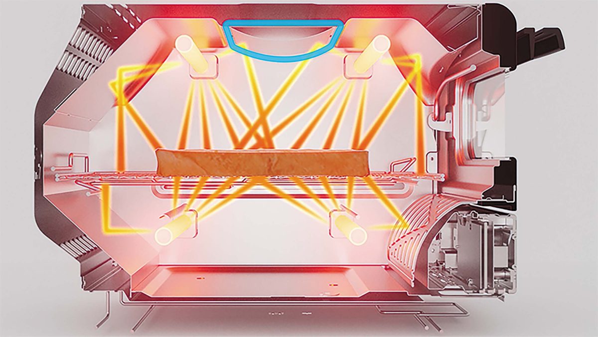 “小さな入口にアーチ型の形状で、熱を逃がしにくい”という、石窯からヒントを得た独自構造を採用。食材に効率良く熱を伝え、トーストやピザなどをすばやく・美味しく焼き上げる。マイコンタイプで、コースに合わせて好みの焼き加減を選択可能だ。