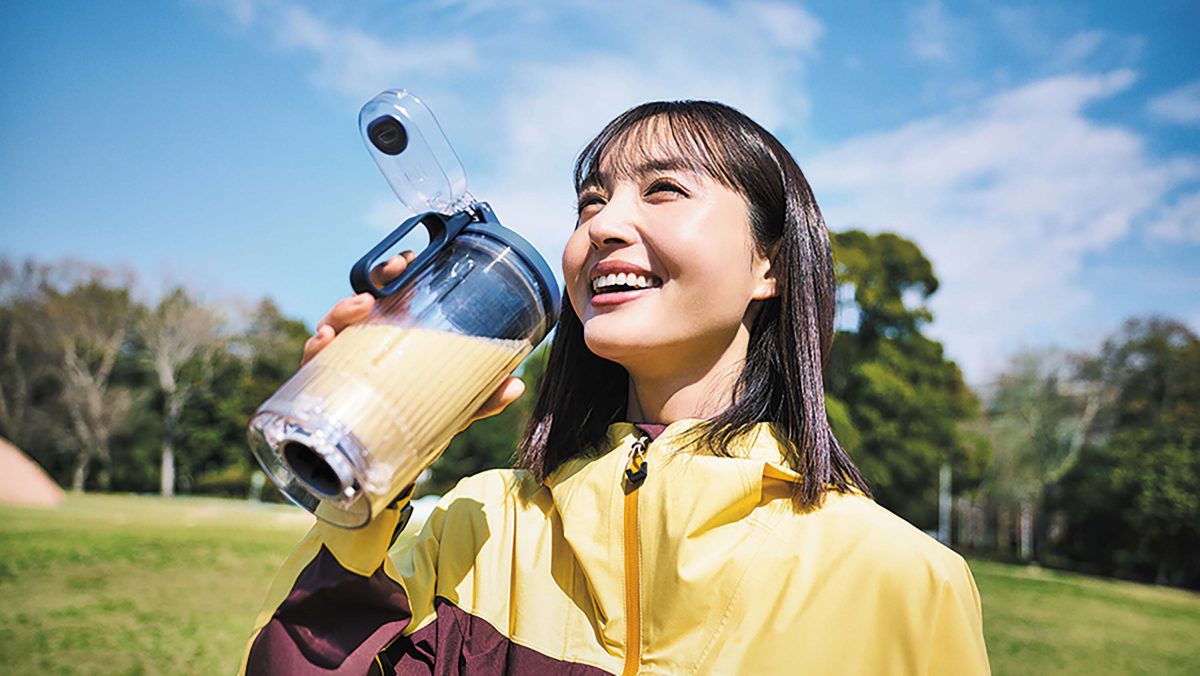 「コードレス&バッテリー内蔵で、出先でも作りたてのドリンクを楽しめるがイイ! 蓋には飲み口が付いていて、タンブラー代わりにもなります。スムージーや料理の下ごしらえ、硬い食材の撹拌もお任せあれ! です」(家電女優・奈津子さん)