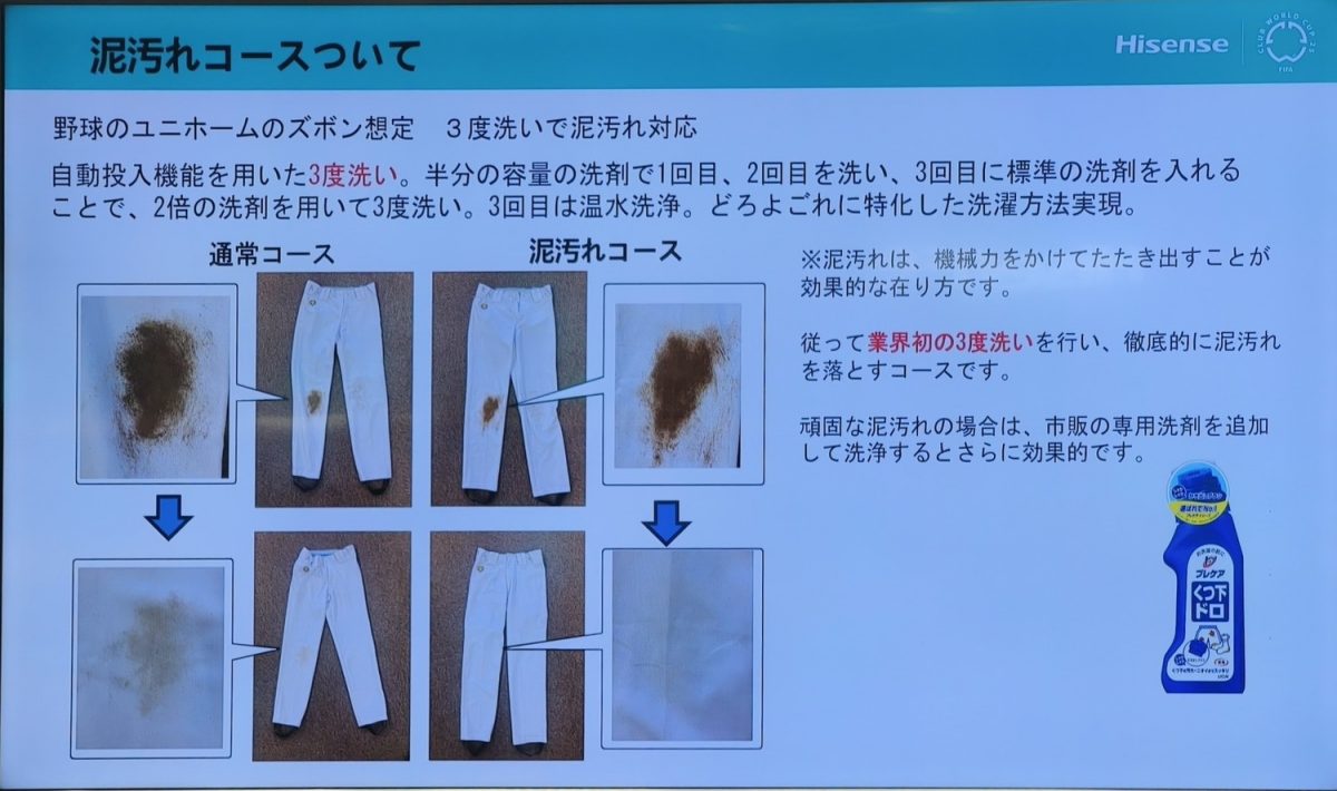 泥汚れコースは、洗剤自動投入機能をフル活用した「3度洗い」をするコースです。半分の容量の洗剤を入れて1回目、2回目を洗い、3回目に標準の洗剤を入れて温水洗うことで、2倍の洗剤量を用いて3度洗いを実現します。今井氏によると、「3回洗いで徹底的に洗えるのも、自動投入機能が搭載されているからこそできる機能です」とのこと。