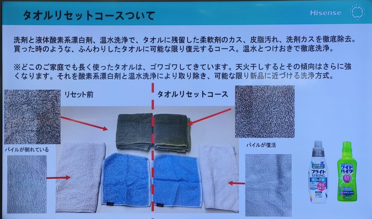 さらに興味深いのがタオルリセットコースです。これは通常のタオルコースとは違い、使い古してゴワゴワになったタオルをリセット、つまり元の柔らかさを復活させるユニークなコースです。