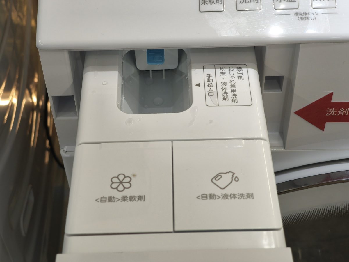 冒頭で紹介したように、便利な液体洗剤・柔軟剤自動投入機能も備えています。本体上部に洗剤・柔軟剤を投入するタンクを備えており、タンク容量は液体洗剤が700ml、柔軟剤は600mlとなっています。引き出し式になっており、外して洗うことも可能です。