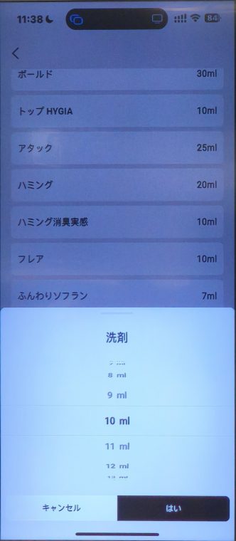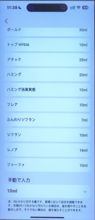 液体洗剤や柔軟剤は、スマホ向け「ConnectLife」アプリ(Android/iOS対応)でメーカーから銘柄を指定して設定できます。また、3mlから30mlまで手動で標準投入量を設定することも可能。本体パネルで投入量を設定することもできますが、スマホアプリで設定するのが最もラクなのではないでしょうか。