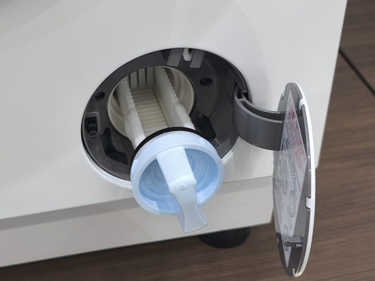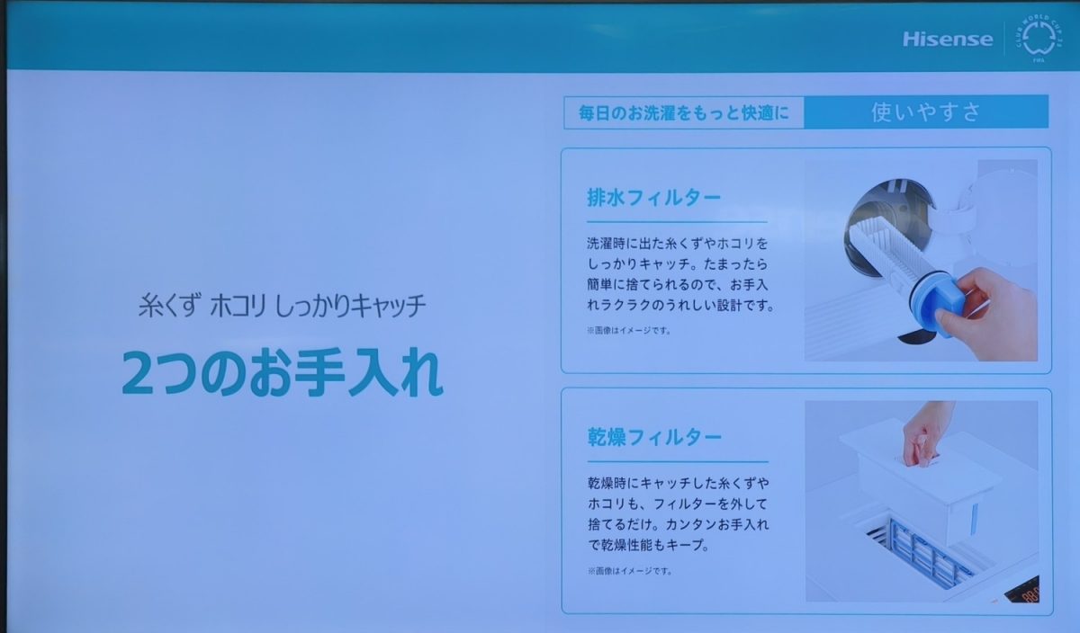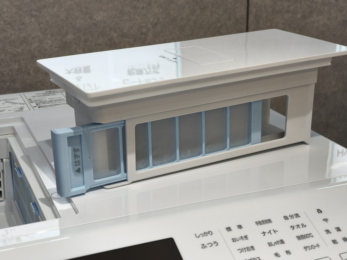 なお、普段のメンテナンスでは、本体下部の排水フィルターにたまった糸くずやゴミを捨て、乾燥フィルターにたまった糸くずやホコリを捨てるお手入れが必要です。本機では排水フィルターをクシ状にして汚いものを触らずに洗い流せるようにするなど、日々の手入れをラクにする工夫を施しています。