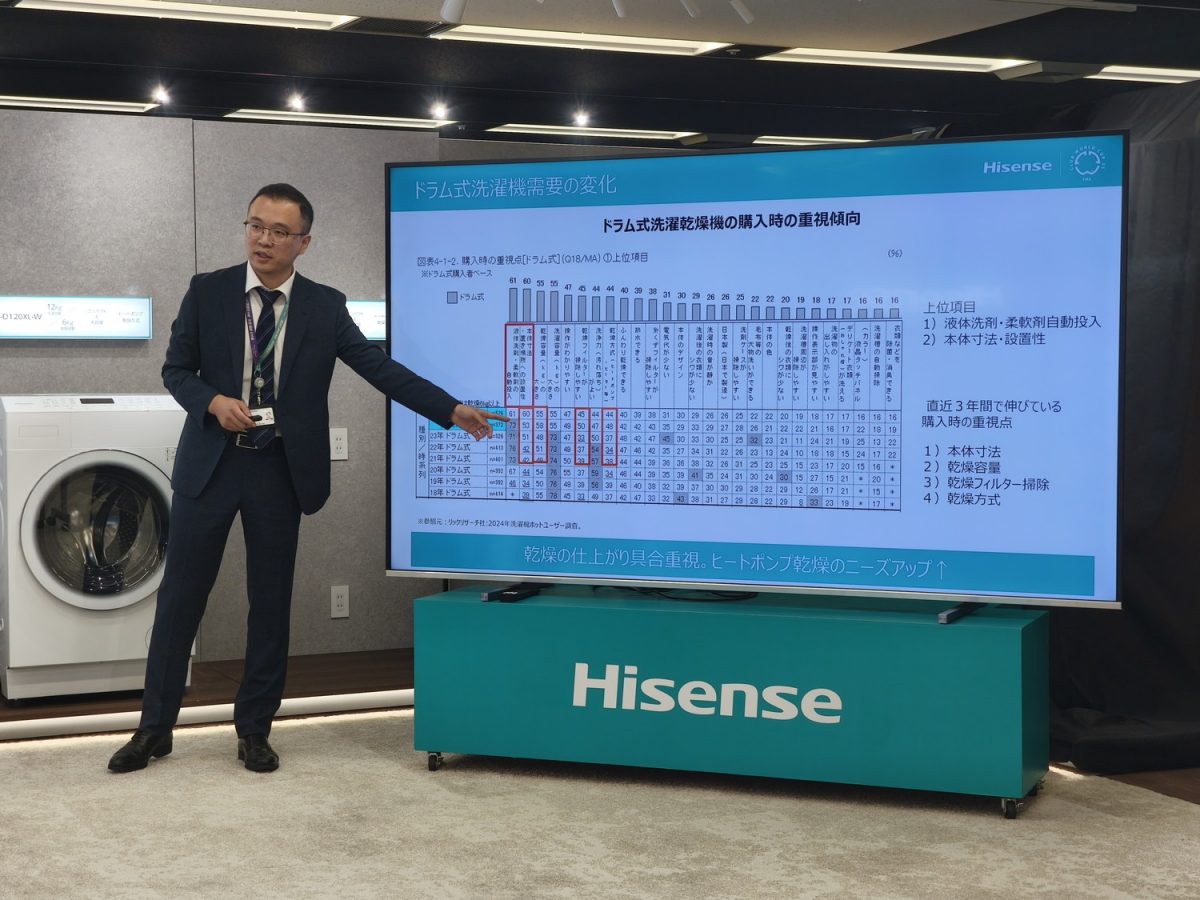 「液体洗剤と柔軟性の自動投入機能の重視度が1位ですが、直近3年間では設置性の重視度が上がっている。共働き世帯が増えているためか、洗濯容量だけでなく乾燥容量の重視度が高まっているのも見受けられます。また、乾燥フィルターの掃除のしやすさも注目度が上がっています。さらに、最近の環境意識の高まりもあり、乾燥方式に対する重視度も上がっています。こうしたことから、我々ハイセンスはコストパフォーマンスの高いミドルレンジの価格帯を狙って開発しました」(李氏)