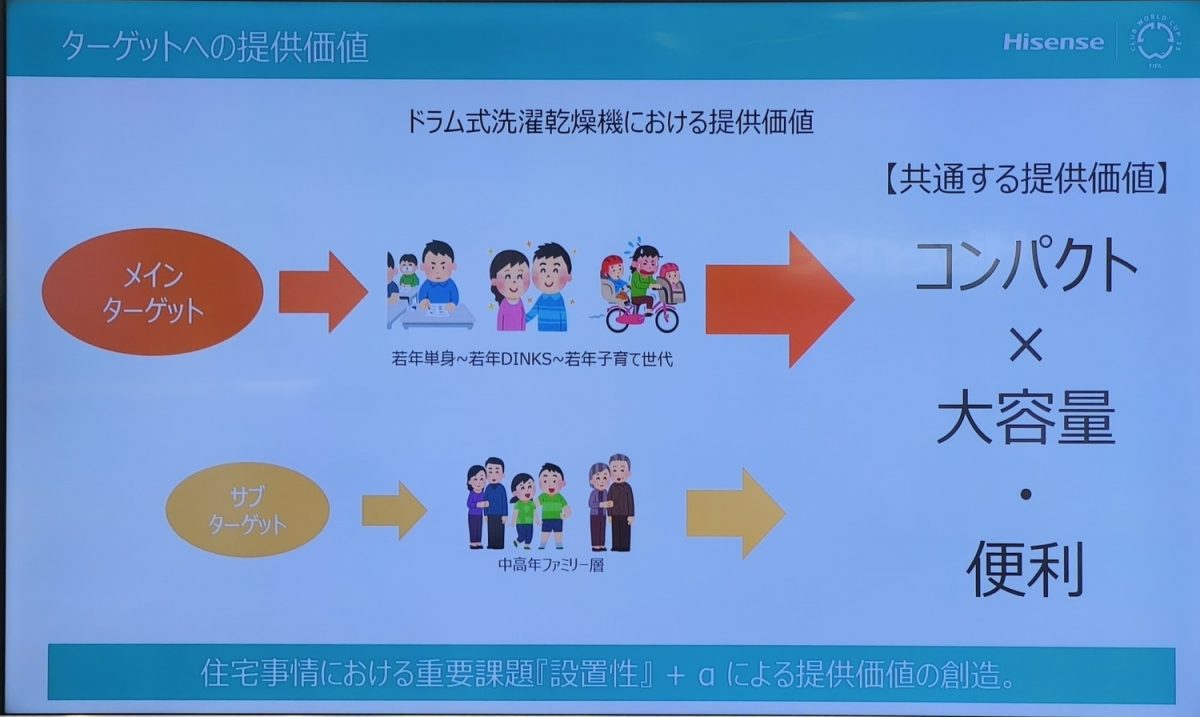 メインのターゲット層はハイセンスのテレビが得意としている若年層のほか、単身世帯や子育て世帯を狙っていくとのこと。サブターゲットは中高年のファミリー層で、共通した提供価値は「コンパクト×大容量、そして便利です」(李氏)とのこと。