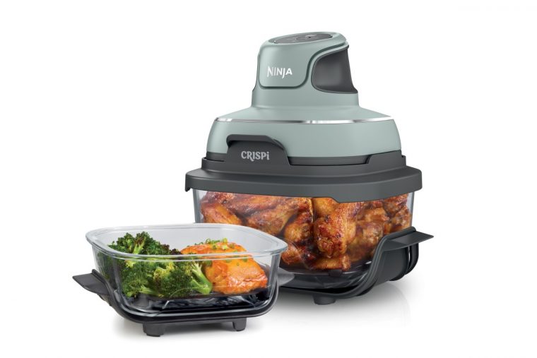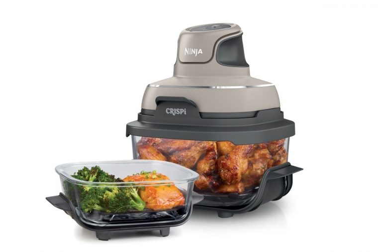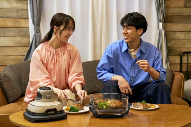 「Ninja Crispi テーブルクッカー」は、ガラスコンテナに食材を入れて「下ごしらえ、加熱調理、サーブ、保存、温め直し」までが一台で完結できる、新感覚のテーブルクッカーです。強力熱風ファン、高火力ヒーター、高熱伝導プレートの組み合わせにより、ジューシーで本格的な仕上がりを実現します。
