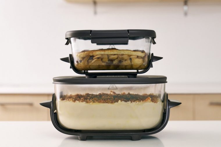 強力な熱風と熱伝導プレートにより、高火力で卓上調理できるテーブルクッカー。大小2サイズのガラスコンテナが付属するので、料理や作る量に応じて使い分けられます。コンテナは蓋をしてそのまま保存OK。電子レンジにも対応するので、簡単に温め直しもできます。