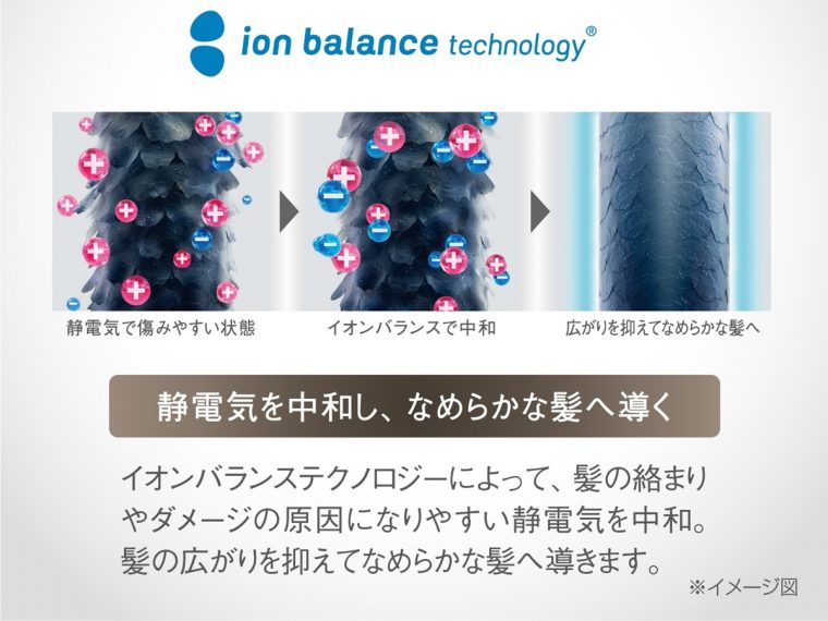 本製品は、プラスとマイナスのイオンを発生させる「イオンバランステクノロジー」を搭載。髪全体の静電気を中和し、髪の広がりを抑えてまとまりよく、なめらかな髪へ導きます。