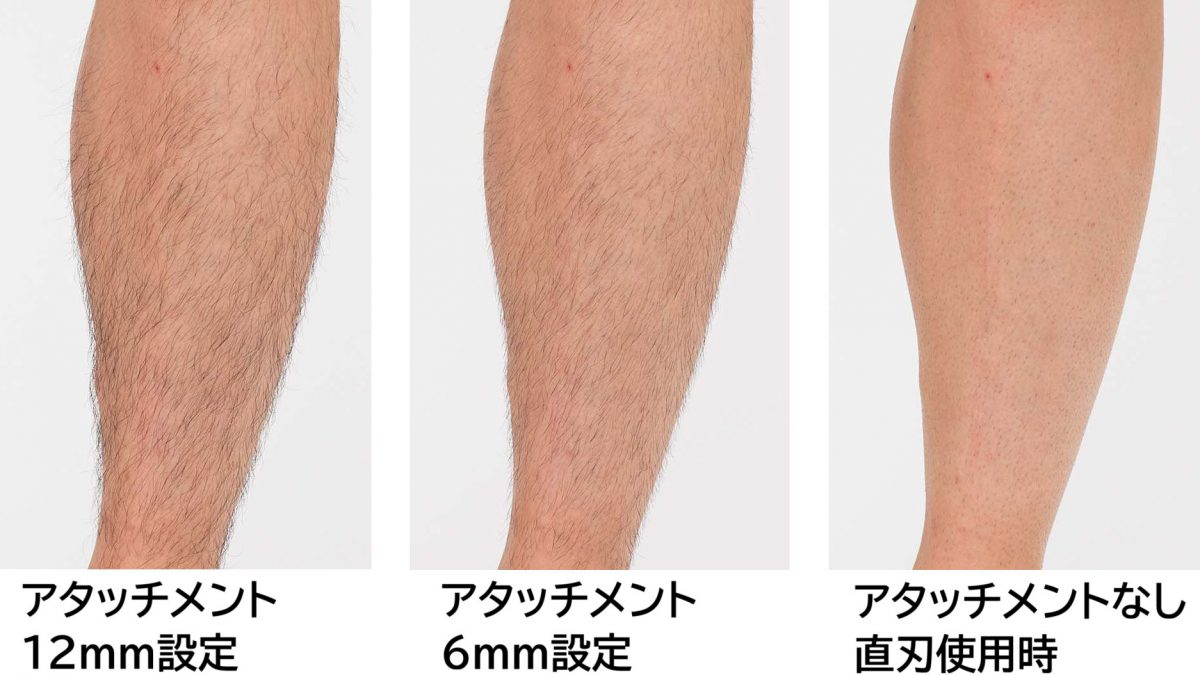肌ガードアタッチメント(2mm)とダイヤル式長さそろえアタッチメント(3mm~12mm・1mm刻み)の2種類のアタッチメントが付属 。 直刃使用時(約0.1mm※4※5)と合わせて12段階で設定できるので、好みの長さで剃ることが可能だ。