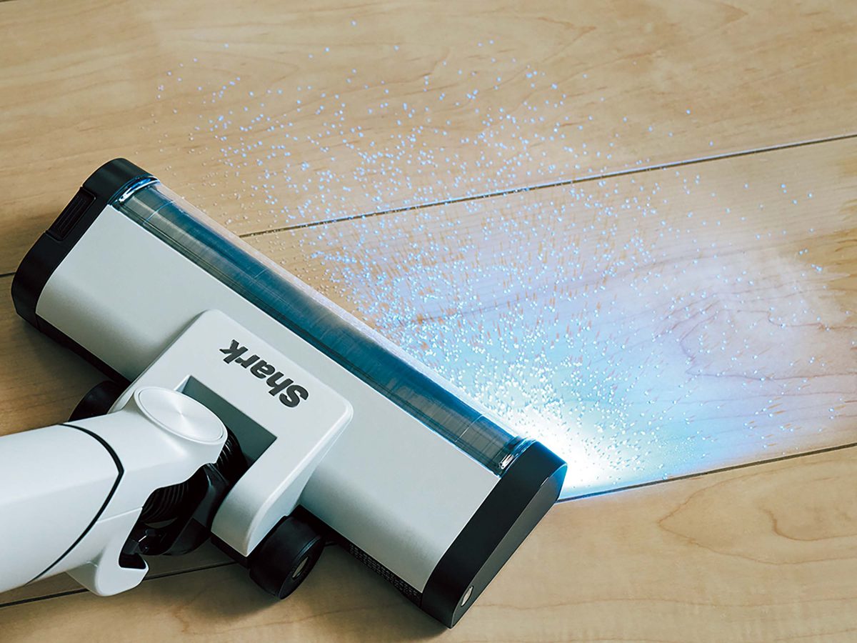 新搭載の「青色LEDヘッドライト」が、目にとまりにくい小さなゴミやホコリを見える化し、部屋の隅々のゴミも逃さない。一般的な緑色LEDよりも、より近距離のゴミが見えやすい。