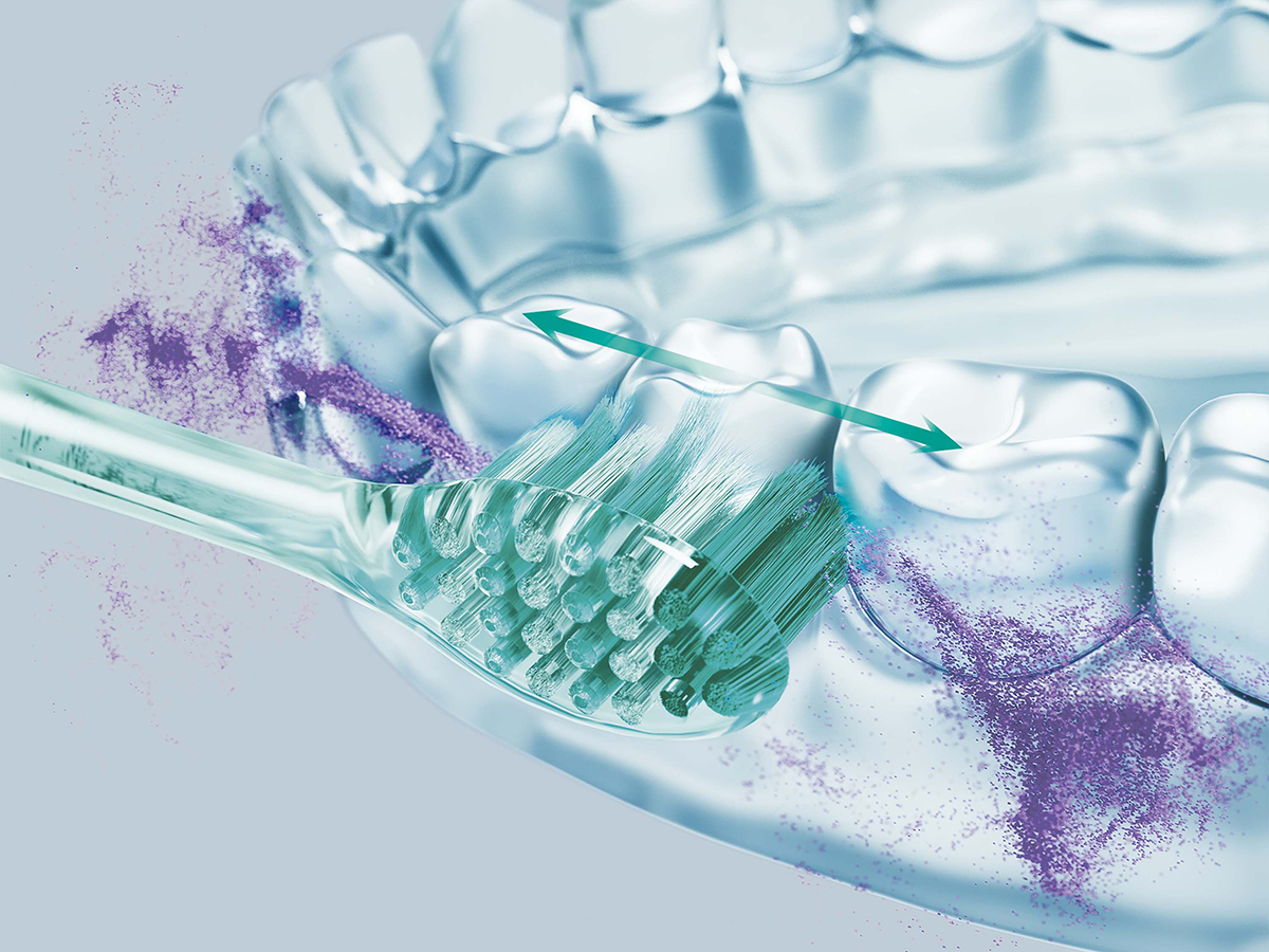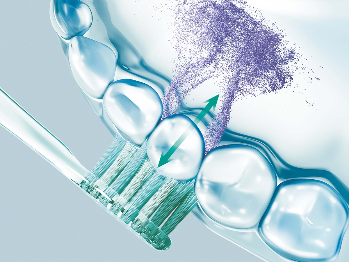 歯周ポケットに入り込むヨコの動き(リニア音波振動※3)と、歯間に入り込むタタキ方向の動き(フロス音波振動※3)を実現。磨きづらい場所に潜む歯垢を除去する。