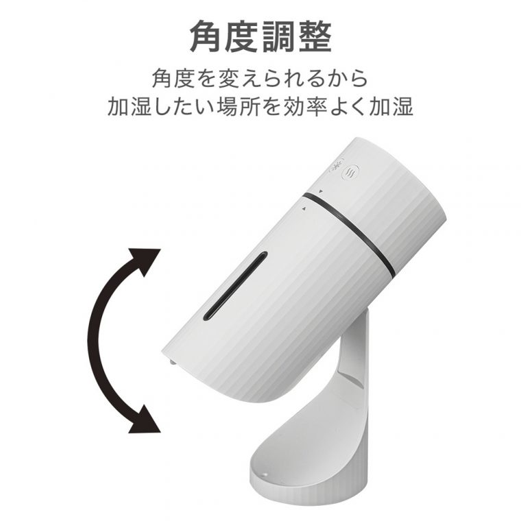 本製品は、デスクやベッドサイド、キッチンなどさまざまなシーンで使えるコンパクトな超音波式加湿器。ミスト噴射口の角度を自由に調整できるため、デスクワーク中や、就寝時の顔まわりなど、必要な場所だけを効率よく潤します。