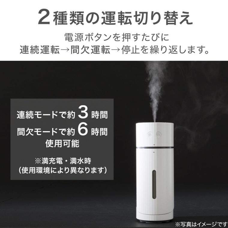 加湿量は2段階(連続運転/間欠運転)で切り替えが可能で、オートオフ機能(連続運転4時間・間欠運転8時間)も搭載しています。