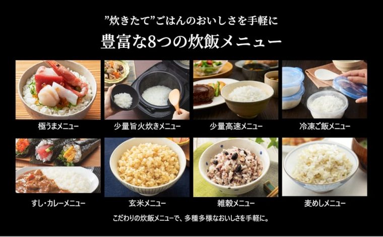 さらに、お米の全ての良さを引き出す「極うま」メニューや、0.5合から2合まで、その日そのとき食べる分だけのお米をおいしく炊きあげる「少量旨火炊き」メニュー、冷凍用のごはんがおいしく炊ける「冷凍ご飯」メニューなど、8つの炊飯メニューも備わっています。日々の食事に合わせて炊き方を変えられるのは、なかなかうれしいポイント。