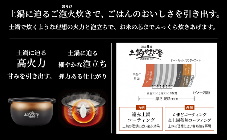 内なべ外側には、「土鍋蓄熱コーティング & かまどコーティング」を採用。上部には熱伝導性の高い銅素材、下部には蓄熱性の高い土鍋素材のコーティングを施し、土鍋の理想に近い蓄熱性が再現されているそう。この上下のコーティングの温度差がつくる沸とうで強い対流が生まれることで、お米が芯までふっくらと炊きあがるとのこと。また、内なべに施された「遠赤土鍋コーティング」が遠赤効果を高め、土鍋のような細やかな泡立ちで沸とうし、お米のおいしさを引き出してくれるそうです。
