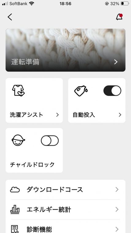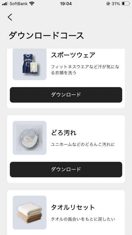 操作パネル上のプリセットコースに加え、8種類の「ダウンロードコース」なるものも用意されています。ハイセンスの専用アプリ「ConnectLife」から「二度洗い」「泥汚れ」「部屋干し」「ベビー衣類」などを選んで本体に送信すれば、コースを追加できるのです。前述の“ゆらゆら洗い”をしてくれる「ランジェリー」や「洗えるスーツ」もダウンロードコースの1つ。