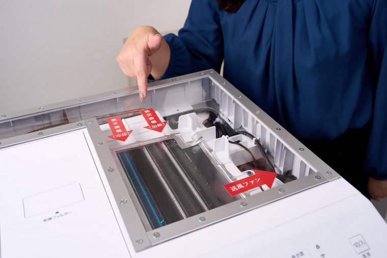 一口に薄型・コンパクトにするといっても、これがなかなか大変なこと。そもそも洗濯容量12kgの大容量だと洗濯槽も大きいため、必然的に本体は大きくなります。さらに乾燥方式に採用しているヒートポンプユニットも大型化しがちですが、内部配置を徹底的に見直すことで、薄型・コンパクト化に成功しています。