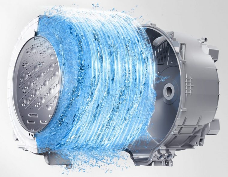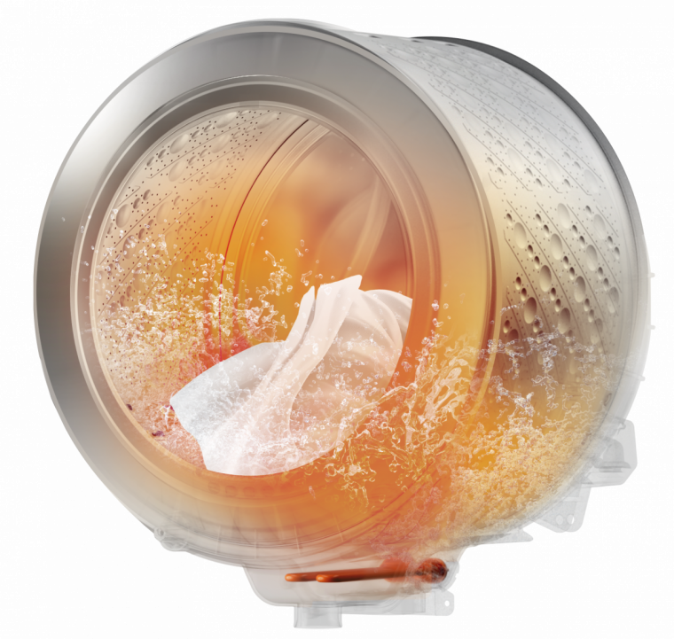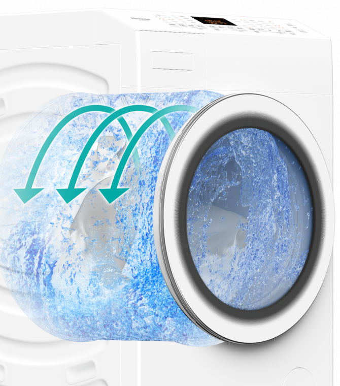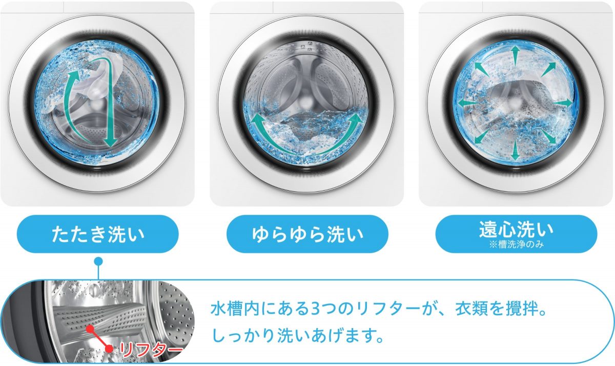 設置の悩みをクリアしたうえで、洗濯機に求められる基本性能といえば、やはり洗浄力。本機はその洗浄力向上に、水平ドラムが重要な役割を果たしています。