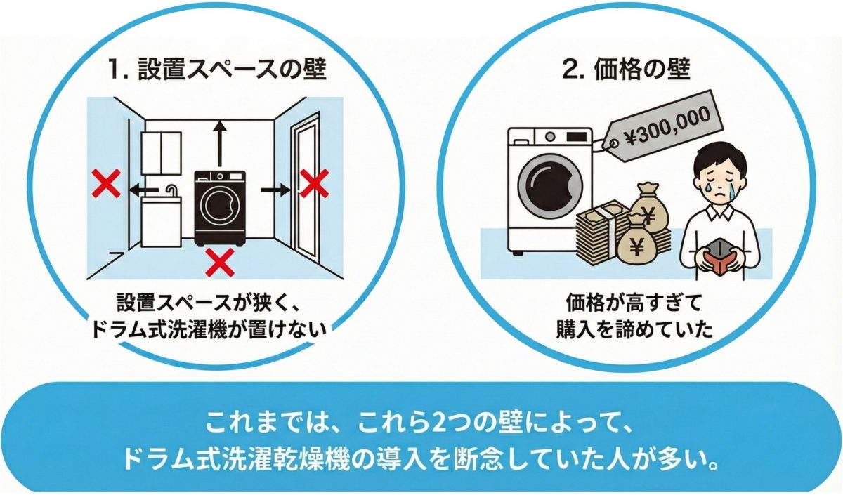 ドラム式洗濯乾燥機は家事の負担を軽減してくれる存在ですが、いざ導入したいと思っても、いくつかのハードルがあり、諦めたという声をとてもよく聞きます。