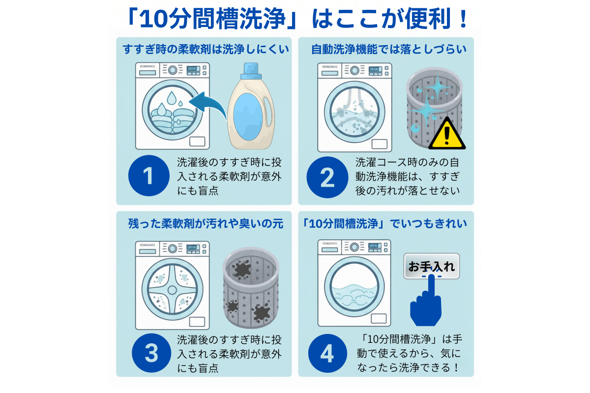 さらに“きれい”が続く、同社独自のうれしい機能も!前述の自動槽洗浄は、洗濯のたびに行われるもので、実は多くの他社製品にも搭載されています。でも実は、これだけではお手入れは不十分。というのも、洗濯工程ではすすぎの最後に柔軟剤が投入されるため、自動槽洗浄をしても柔軟剤は残りやすく、これがカビやニオイの原因になることがあるのです。