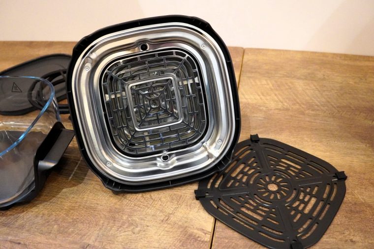 本体の構造は、内部に1400Wの高火力ヒーターと大型の熱風ファンを搭載。これに加えて、アルミニウム製の高熱伝導プレートをコンテナ底部にセットすることで、優れた熱伝導の効果を発揮し、食材を包み込むように加熱します。