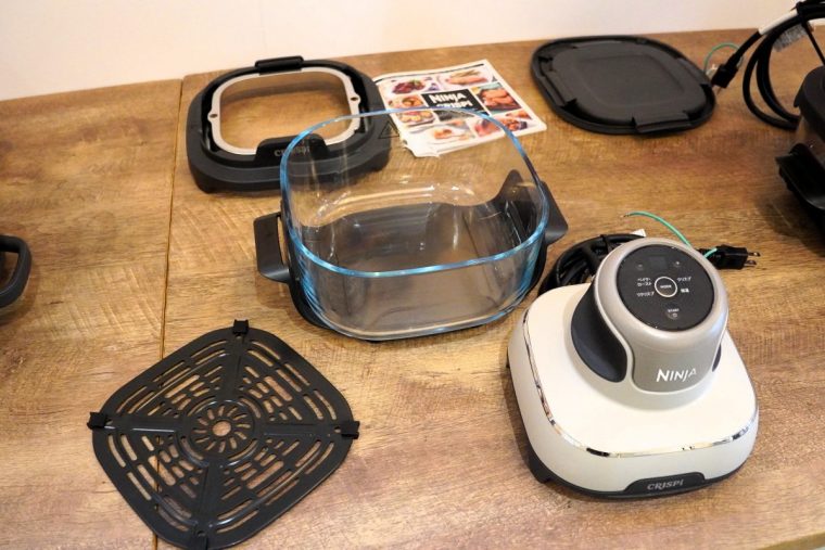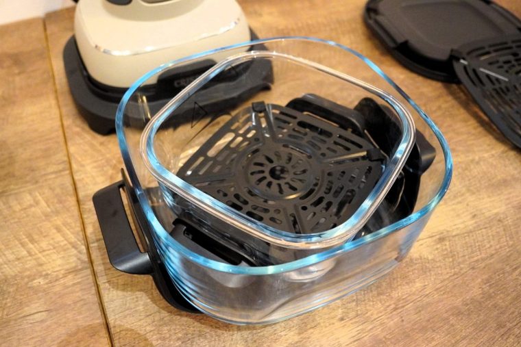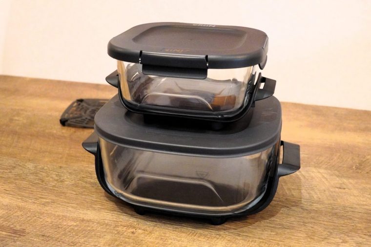 発表された1つ目の製品は、「Ninja Crispi テーブルクッカー」。パワーポッド(本体)とガラス製のコンテナ(容器)から成る卓上クッカーで、1台で下ごしらえから調理、食卓での提供、保存、温め直しまで完結するのが特長です。電源さえあれば、キッチンのみならず、どこでも調理ができるため、お手軽かつ、その場で取り分けて食事を楽しめる点も魅力です。
