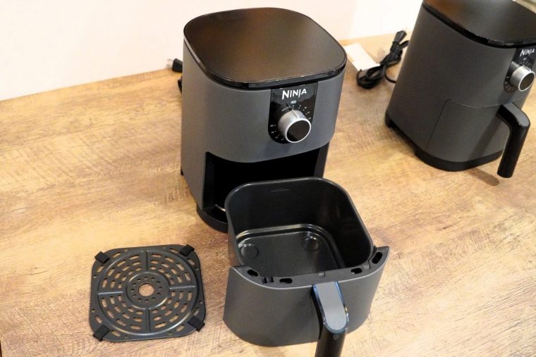 3つ目は「Ninja ミニエアフライヤー」。幅20cmとコンパクトなエアフライヤーで、使用する際も収納時も省スペースなため、気軽に利用できることが魅力。強力な熱風で食材を包み、外はカリッと中はジューシーに調理。Crispi テーブルクッカー同様、油を使用しないノンフライヤーのため、油で揚げた場合に比べて油分をカットできます。操作部は時間を設定するダイヤルのみのシンプルな設計で、誰でも簡単に使えます。