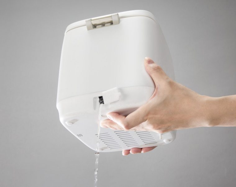 電源コードは着脱式、本体下部には排水ボタンを搭載。ワンタッチで排水が可能なのでお手入れも簡単です。乾燥モード(電源ON後にモードボタンを約10秒以上長押し)も搭載しており、長期間使用しない場合の保管にも便利です。