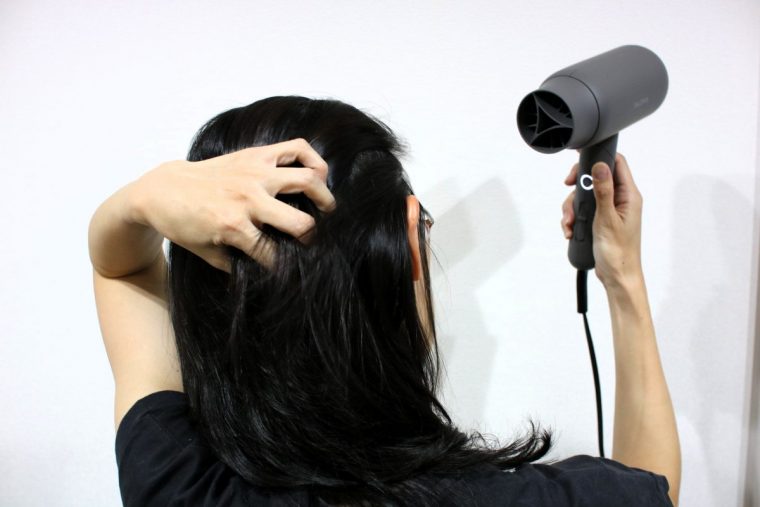 地肌に残る水分を乾かすのにかかった時間としては、6分ほど。速乾ブーストノズルを付け、強風モードにして乾かしてみたものの、「結構かかるな」という印象です。とはいえ、低温なうえに乾燥を感じさせないやさしい風当たりなので、妥当な結果なのかもしれません。