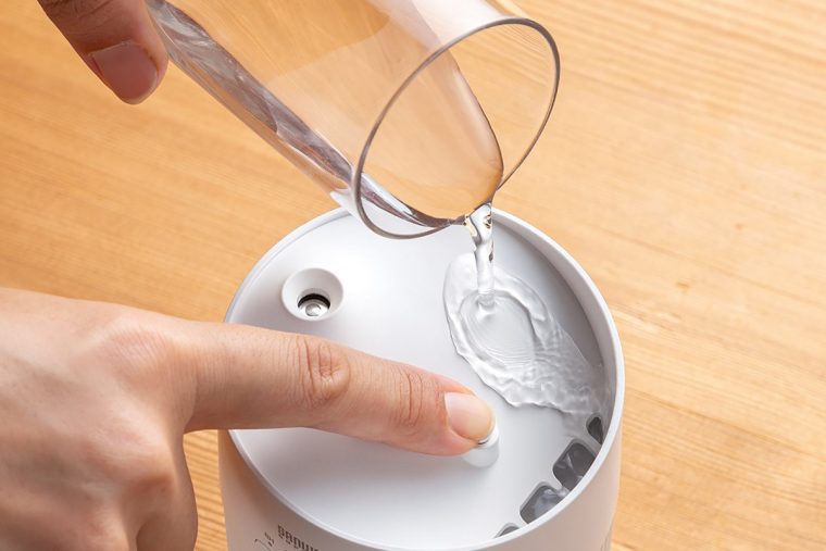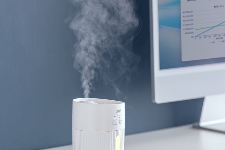乾燥が気になる季節に活用したいコンパクトな卓上加湿器。自分の周囲だけ加湿できるので、オフィスや就寝時の使用に最適です。フタの上からそのまま給水できて、手間がかからないのが◎。