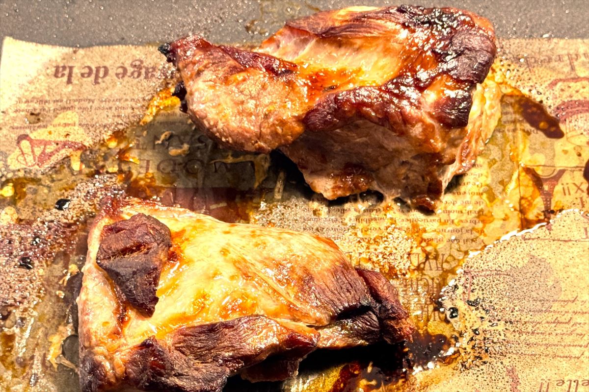今回、すご技オーブンのレシピとして焼き豚(チャーシュー)を作ってみました。豚肩ロース肉をタレに漬け込んだあと、自動メニューの「40 焼き豚」を選び、予熱が終わったら角皿に載せた豚肉を入れてスタート。とても簡単です。