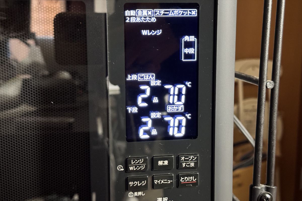 ただし、実際に使ってみて気になった点もあります。1つは機能が多いぶん、直感的な使い方がしにくかった点です。特にWレンジでの時短あたためは手動モードでしか設定できないため、時短したいときにいちいちメニューをたどって設定する必要がありました。また、角皿が約1.5kgと重いのも気になる点。調理後は熱々で食材も載っているので、慣れるまで扱いに少し苦労しました。