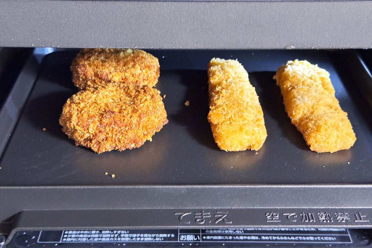 このほか、スーパーで買ってきた惣菜のフライ物は「サクレジ」で表面サクッ、中までホクホクに仕上げられるのが便利! 角皿にコロッケやとんかつ、唐揚げなどを並べて、「サクレジ」ボタンを押すだけ。あとは量に合わせて仕上がりを3段階から選べば、レンジとグリル加熱により衣をサクサクに仕上げてくれます。