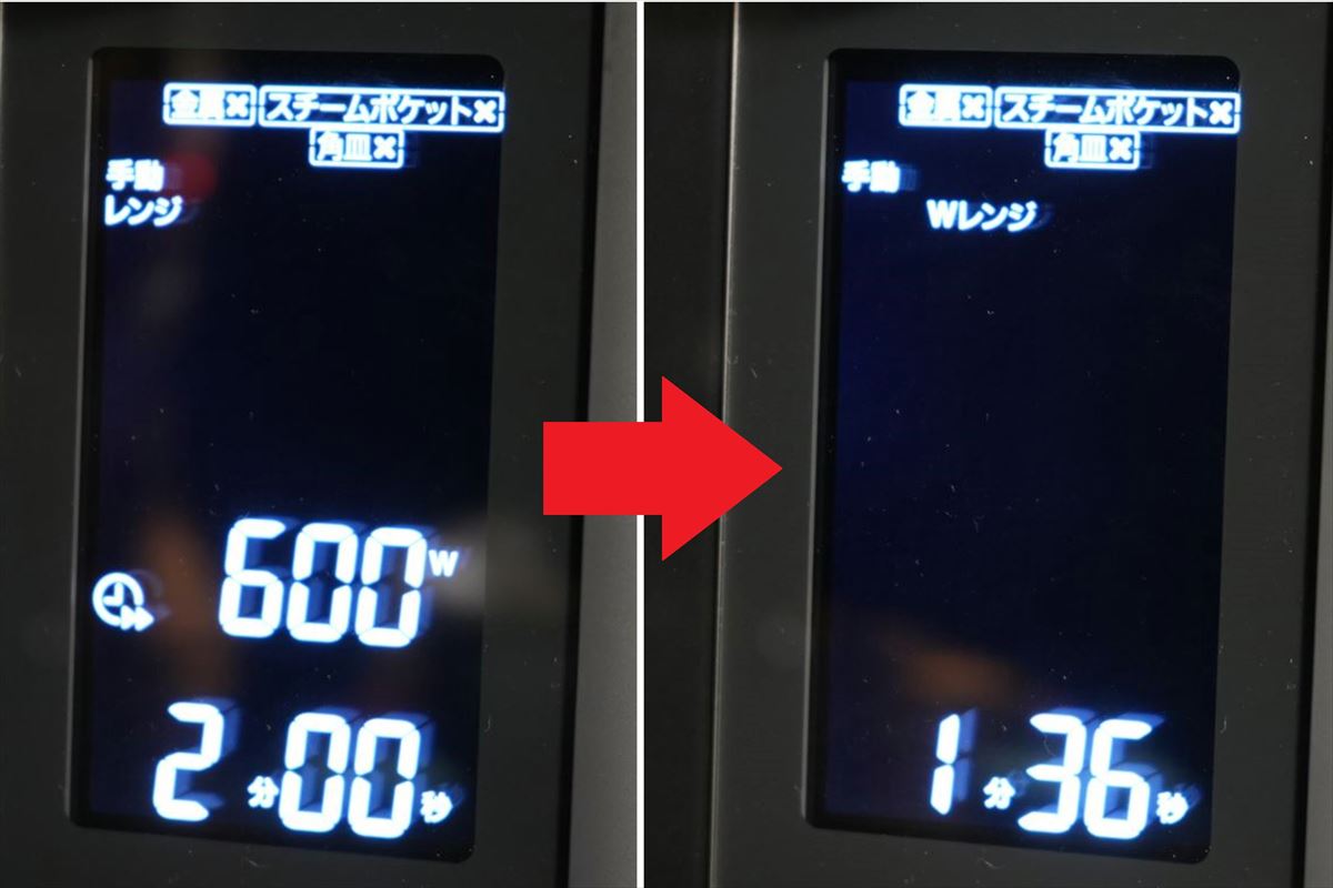時間を設定してレンジ加熱する場合は、「レンジ/Wレンジ」ボタンを押し、出力(W)、時間の順で設定していきます。レンジモードで時間を設定したあとに「レンジ/Wレンジ」ボタンを押して、Wレンジに切り替えると、「すごはやWレンジ」機能により、加熱時間が短く表示される仕組み。実際に設定してみると、あたため時間が3/4に短縮されました。これはうれしい!ただし、Wレンジ機能を使うための動線がややわかりにくく、慣れるまではちょっと時間画がかかりました。