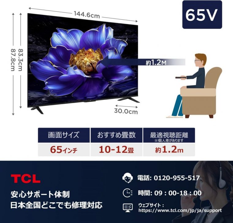 ディスプレイ機器やガジェットなどが人気のブランドTCLから、2025年に発売されたばかりの大型4Kテレビ「TCL 65V6C」も、17%オフの72,800円(税込)で販売中です。