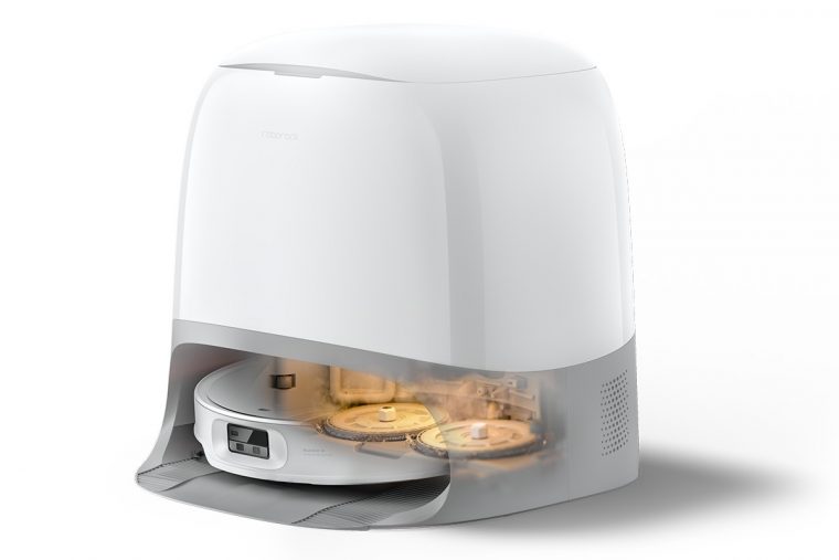 全自動ドックで、ゴミ収集、モップの洗浄や乾燥、給水、高速充電などを行います。ドックにはモップの取り外し機能が備わり、吸引のみのモードで掃除を行う場合、ドックがモップを自動で取り外し、カーペットなどを濡らすことなく掃除できます。