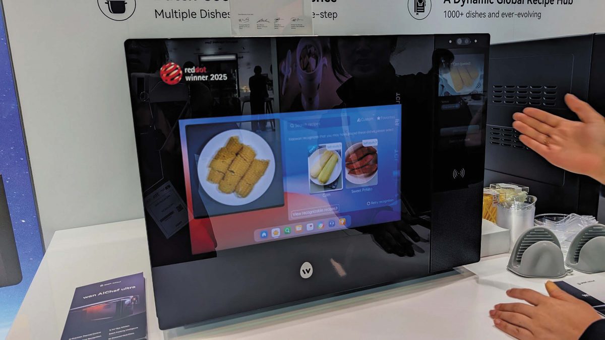 次世代オーブンレンジ「wan AI chef」は、まさに“考えるレンジ”と呼べる製品でした。赤外線センサー、顔認識カメラ、本体内部の天井カメラなど、多数のセンサーを搭載。食材を入れると前面の液晶画面に映し出され、庫内の状態がひと目でわかります。