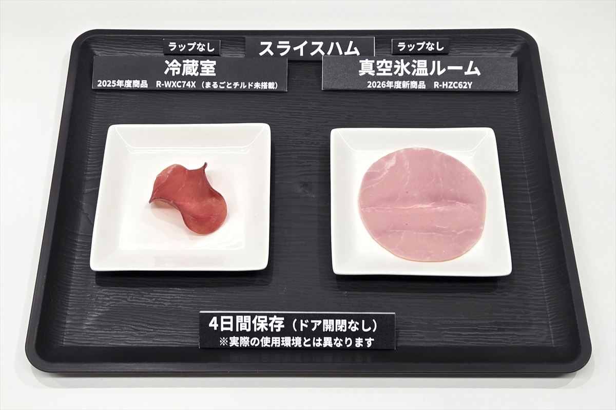 今回、名称を新たに復活した真空氷温ルームは、上段のまるごとチルド冷蔵室の約2℃より低い約-1℃の氷温と、酸化から食材を守る真空環境、さらに、食品に冷気を当てない間接冷却・密閉構造により、肉や魚などの生鮮食品をラップなしでも乾燥を抑えて新鮮なまま保存することが可能になりました。