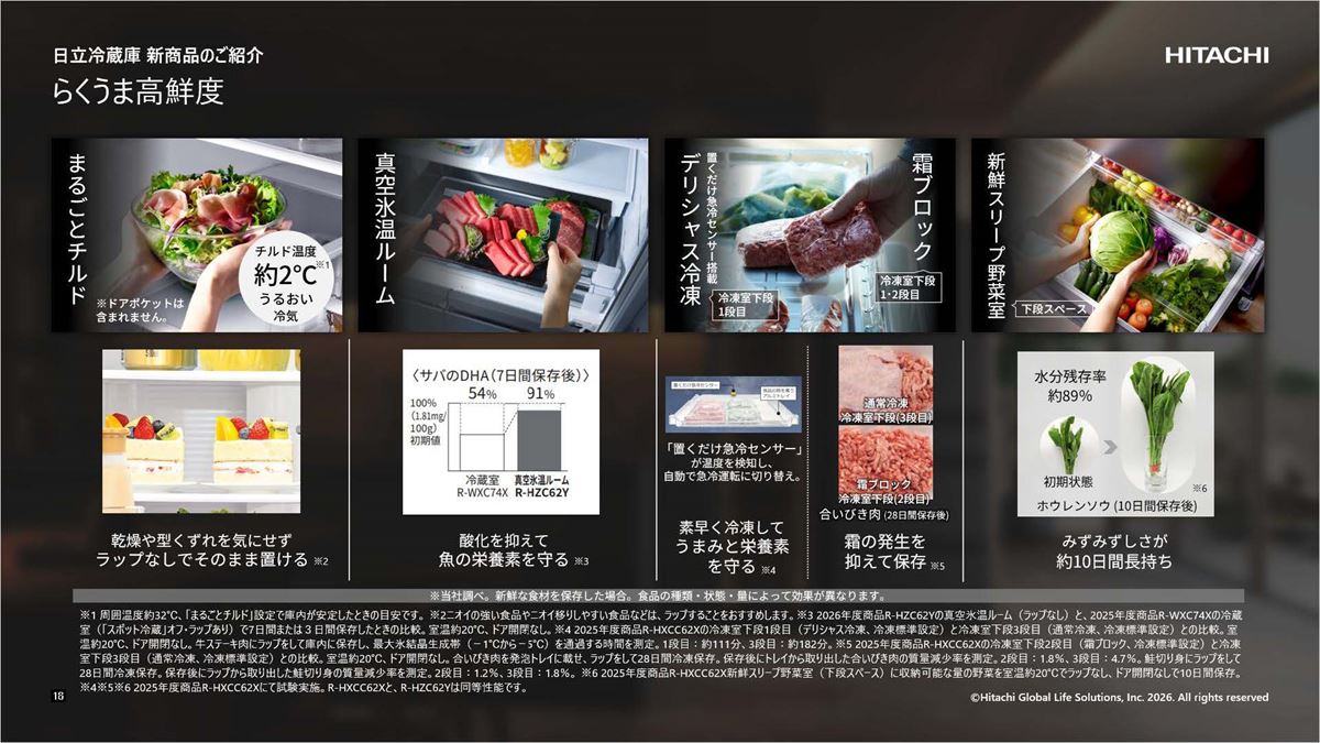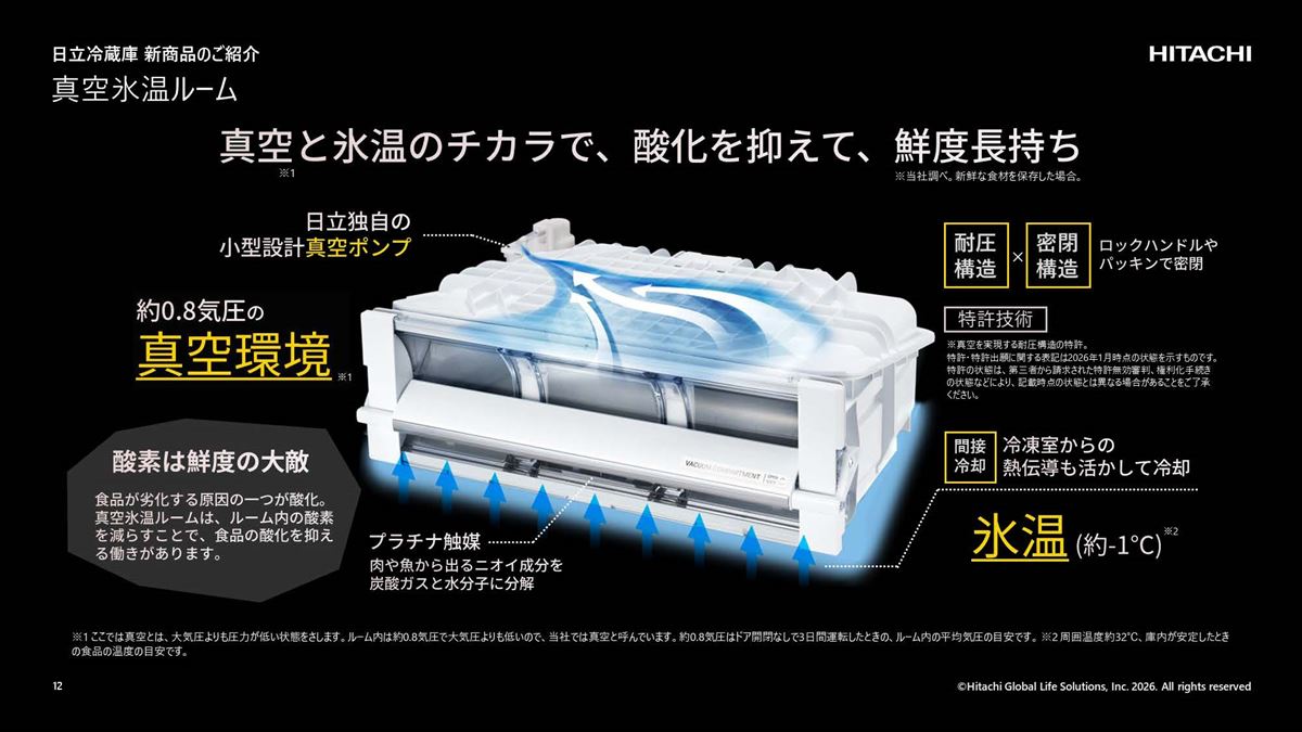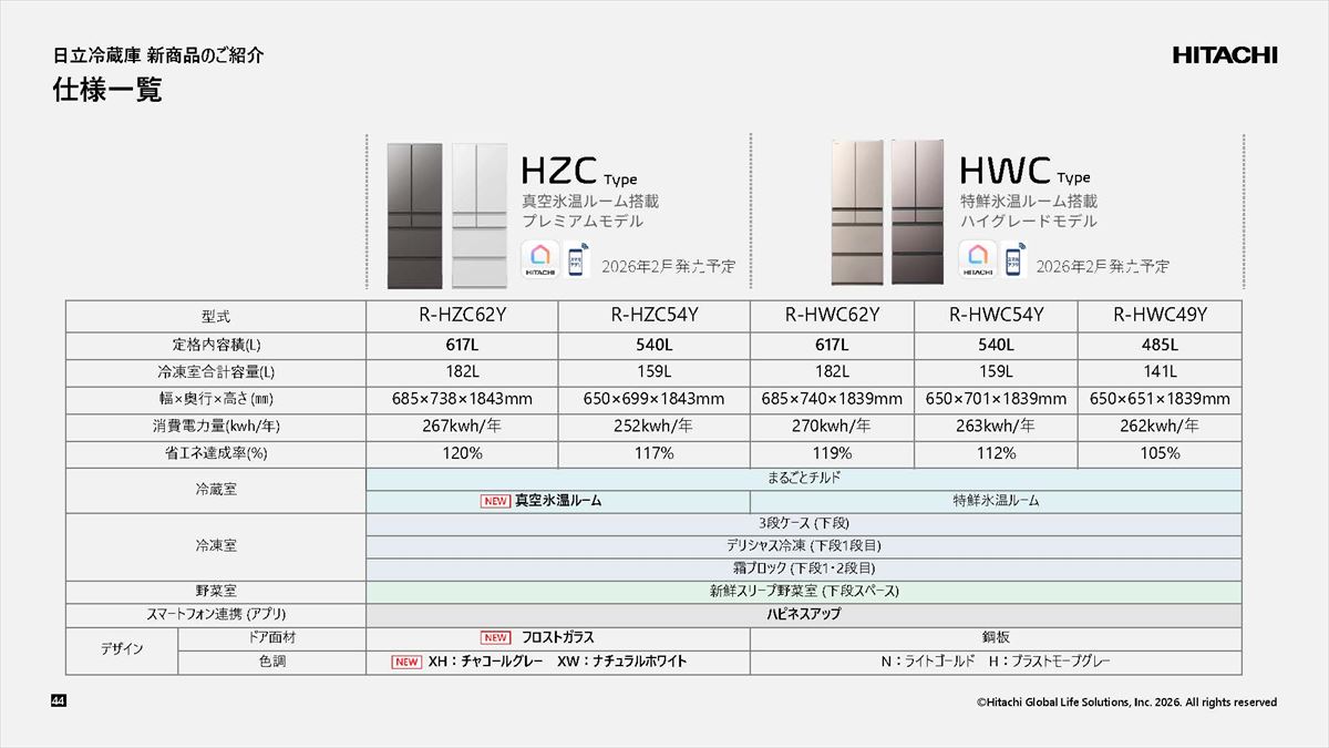 日立グローバルライフソリューションズは、約0.8気圧の真空環境と約-1℃の氷温で食品の鮮度を長持ちさせる「真空氷温ルーム」を新たに採用した冷蔵庫「まんなか冷凍 HZC タイプ」2 機種(定格内容積 617L・540L)を2026年2月下旬から発売します。価格はオープンで、想定実売価格は617Lモデル「R-HZC62Y」が47万円前後、540Lモデル「R-HZC54Y」が42万円前後。