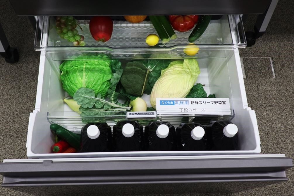 大きな特徴は、開けると“プシュー”と空気が入る音がする「真空ルーム」が復活したこと。日立では、ポンプで空気を吸引して約0.8気圧の真空環境にする「真空チルド」を2007年から導入しましたが、チルドルームが狭くて食材が入り切らないというユーザーからの不満を受け、2019年からは上段の冷蔵室全体をチルド温度帯にする「まるごとチルド」を導入。これにより「真空チルド」を搭載するモデルは姿を消していきました。