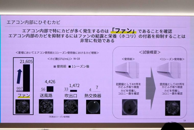 新製品の記者発表会に登壇した、森永名誉教授は「カビは10万種以上。日本酒や味噌の麹のように良い作用を持つカビばかりではなく、食品の腐敗や植物病原菌など悪性のカビも存在する。エアコンに潜む主なカビはクラドスポリウム属の真菌。栄養素となる水分とホコリを抑制することが増殖を防ぐことにつながる」と解説した。