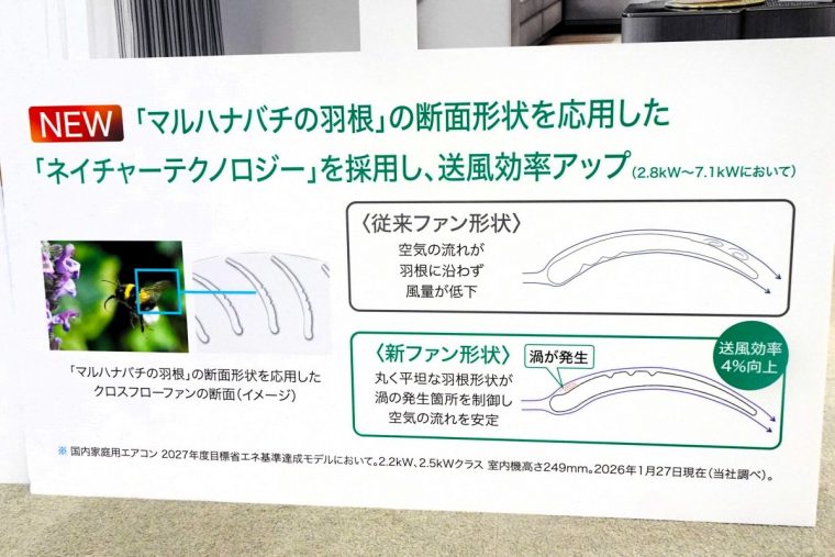 その他、大空間向けモデルの室内機のファンには、新たに「マルハナバチの羽根」の断面形状を応用した「ネイチャーテクノロジー」を採用。マルハナバチの羽根の断面は、先端が丸く平坦な形状をしており、羽根の周りの凹凸部分に渦を発生させることで、摩擦抵抗をなくし、空気の流れをなめらかにしています。今回、この羽根の形状をファンに応用することで、渦の発生箇所を制御し、安定した空気の流れを実現。送風効率を、同社の従来ファン搭載時と比べて、約4%向上させて省エネ性を高めています。