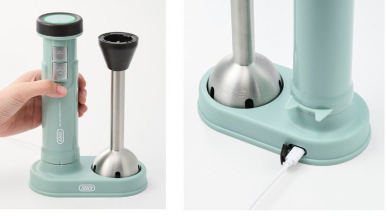 さらに、本体とブレンダーをセットできるUSB充電スタンドと、目盛り付きの専用カップが付属。専用カップは蓋付きなので、準備しておいた食材や調理後もそのまま冷蔵庫で保存することができ、調理以外にも便利に活用できます。